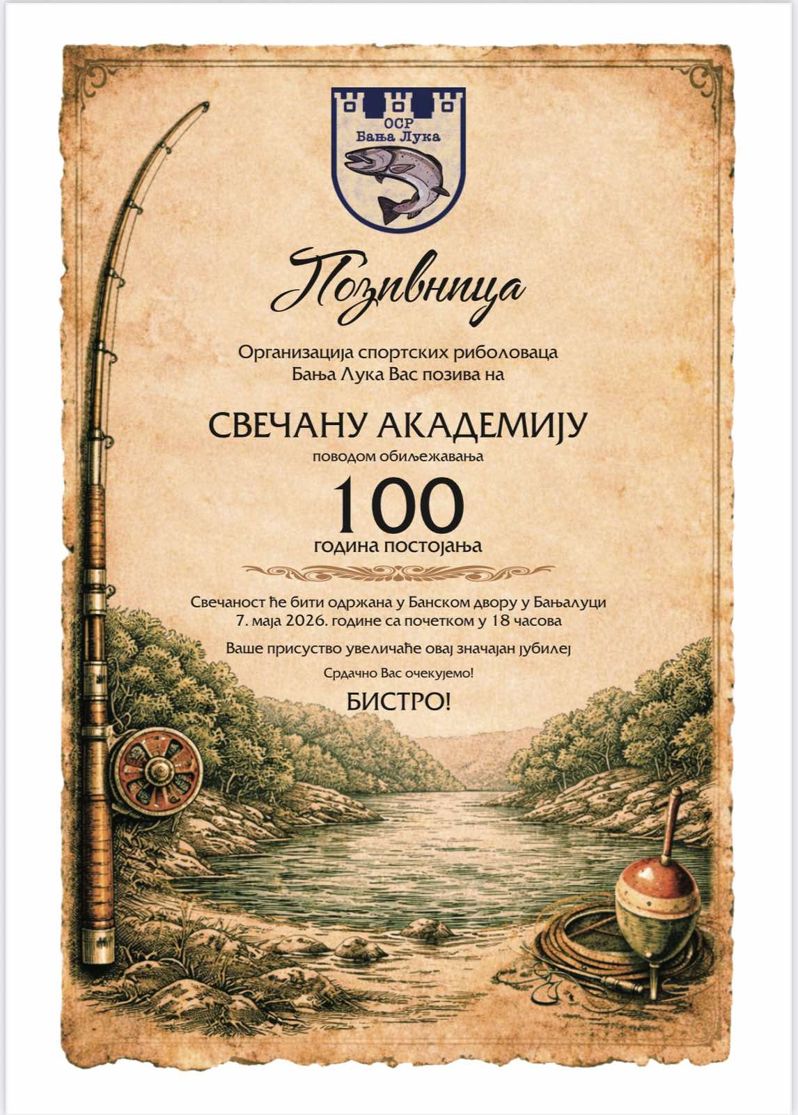 Svečana akademija povodom 100 godina postojanja Organizacije biće održana 7. maja 2026. godine u Banskom dvoru u Banjoj Luci sa početkom u 18.00 časova. Izjava za medije planirane su u 17.40 časova.